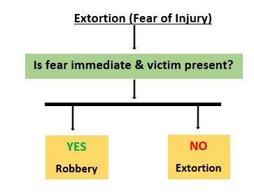 →There must be theft or extortion. →Use of force, violence or fear. →Fear must be immediate. →Victim must be present. →Property is taken instantly. →Dishonest Intention.