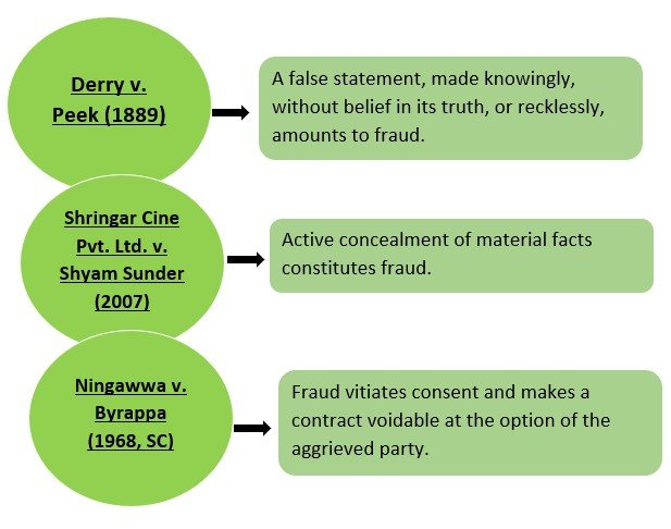 4.Active Concealment of Facts- Hiding material facts which one is legally bound to disclose also amounts to fraud. Mere silence is not fraud, unless there is a duty to speak (e.g., fiduciary relationships, contracts of utmost good faith like insurance).