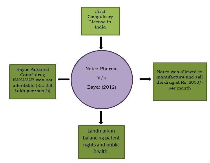 Section 84 to 92 of the Indian Patent Act, 1970 Compulsory Licensing. TRIPS Agreement (Trade Related Aspects of Intellectual Property Rights) also allows for Compulsory Licensing under Article 31.