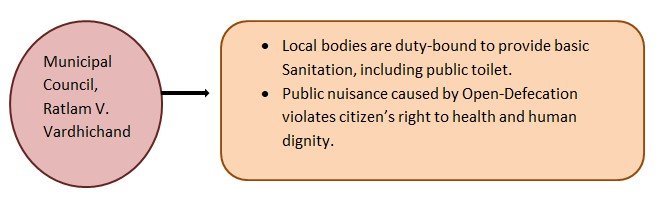 In India, while there is no direct Constitutional Provisions that explicitly mentions "Anti-Defecation" or Prohibition of open - Defecation, Several constitutional provisions, Judicial pronouncement, Government Schemes together address this issue right to dignity, health and environment.