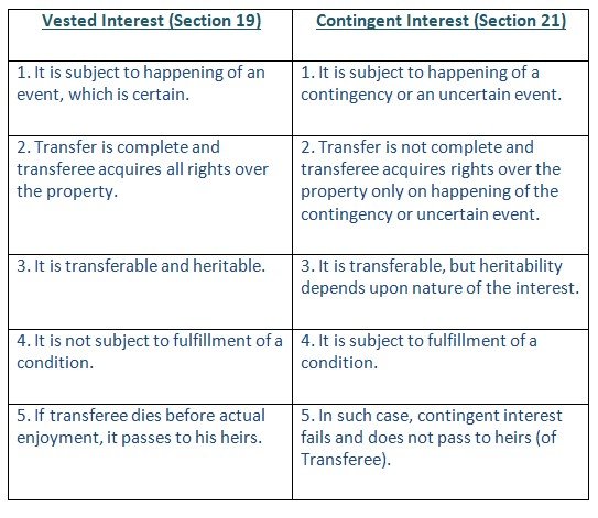 Where, on transfer of property, an interest is to take effect on the happening of an event, which is certain to occur, it is called vested interest. If the interest is to take effect on the happening of an uncertain event or contingency, it is called contingent interest.