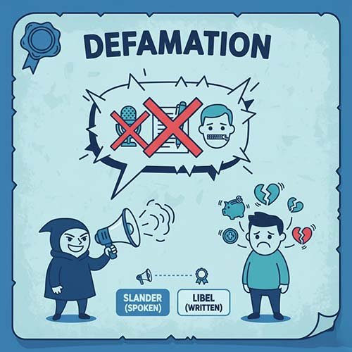 Both forms are recognized under Section 356 of the Bharatiya Nyaya Sanhita, 2023 (Section 499 Indian Penal Code, 1860), though the distinction is more relevant in civil law.