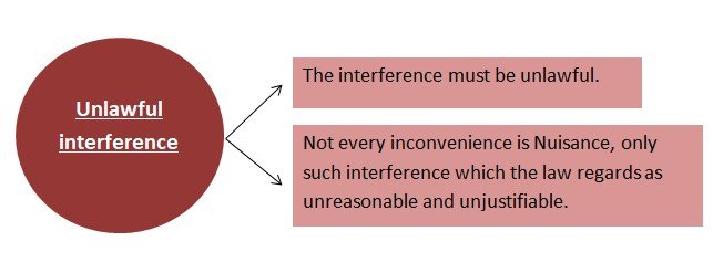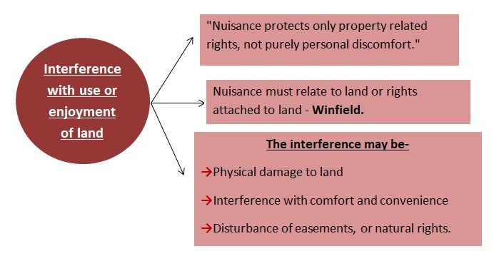 According to Winfield- Nuisance is the unlawful interference with a person's use or enjoyment of land or of some right over, on in connection with it.