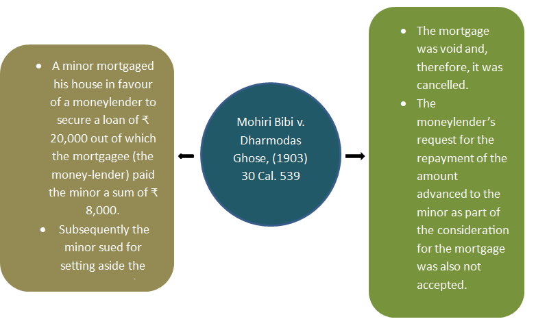 Example- T a minor obtains a loan by mortgaging his property. He is not liable to refund the loan. Not only this, even his mortgaged property cannot be made liable to pay the debt.