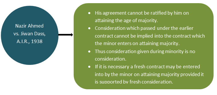 a) P, a minor, borrows ? 5,000 from A and executes a promissory note in favour of A. After attaining majority, he executes another promissory note in settlement of the first note. The second promissory note is void for want of consideration [Indran Ramaswamy v. Anthiappa Chettiar, 1906].